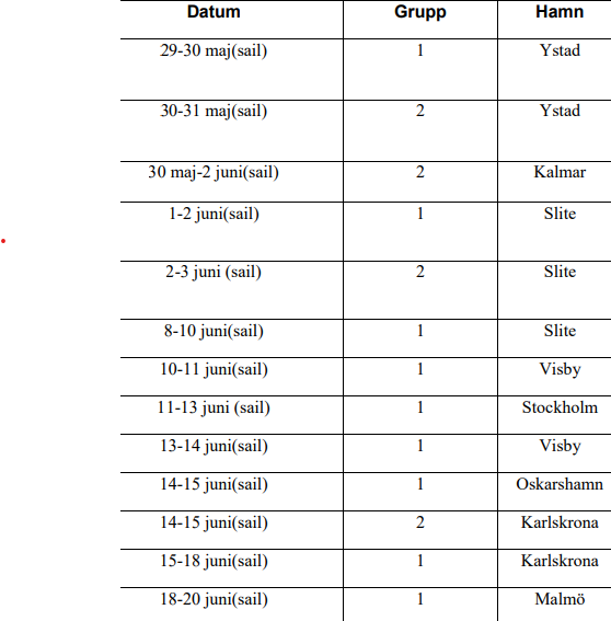 Båtarna är 21 m långa, 6 m breda och har 9 mans besättning. Under besöksperioden kommer tillägg att göras i Ystad, Kalmar, Visby, Slite, Stockholm, Oskarshamn, Karlskrona och Malmö, Datum och hamn anges i tabellen nedan.
