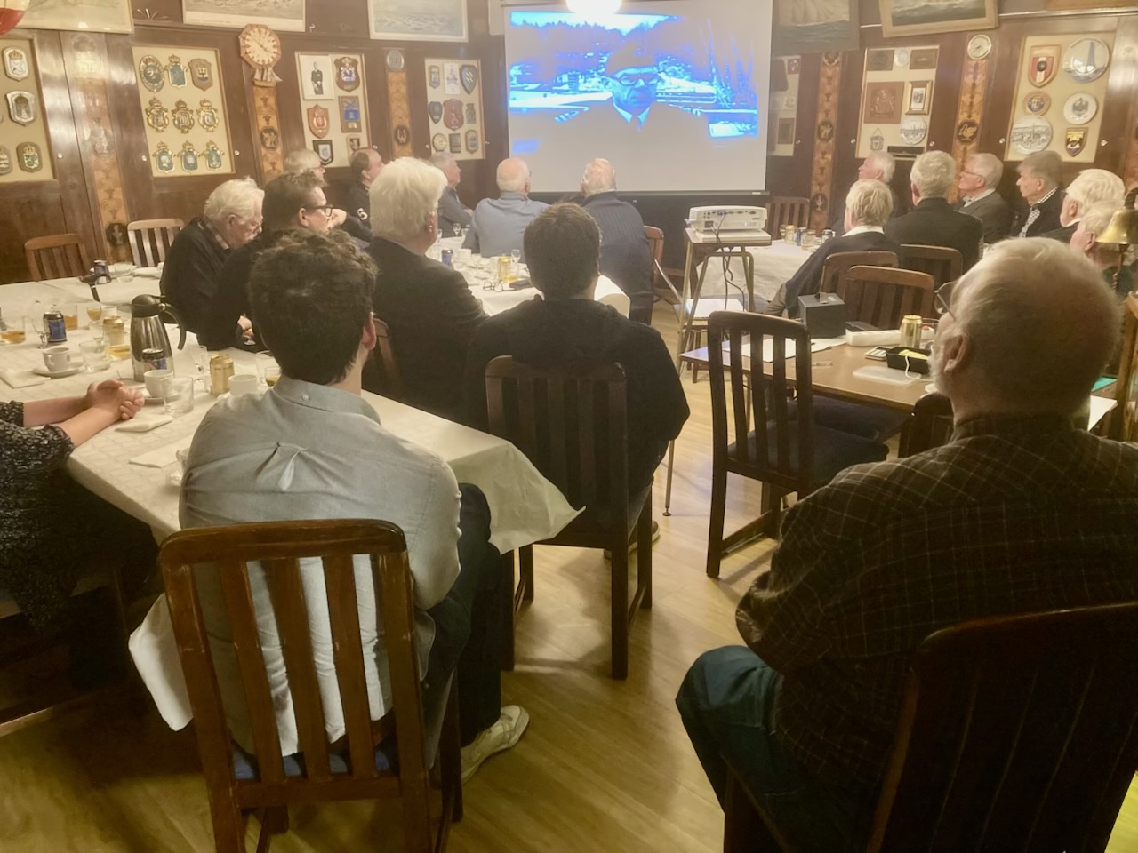 Efter måltiden fortsatte vår medlem Anders Welin sin presentation av filmer av ”Marinen 500 år” vilken informerade om katastrofen i Hårsfjärden 1941 då jagarna Göteborg, Klas Uggla och Klas Horn av fortfarande okänd orsak sprängdes och sjönk. Det som framkom vid utredningen 1941 är hemligstämplat till 2041.