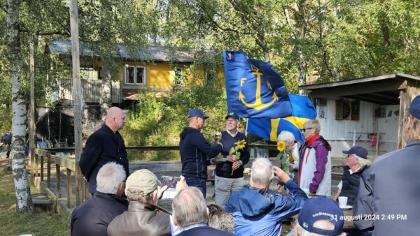 Räkfrossan startade som vanligt med med lite bubbel i trädgården, vädret visade sig från sin bästa sida med temperaturer över tjugo och ”inte ett moln på himmeln”. Ordföranden hälsade alla välkomna och 28 personer hade slutit upp. Nio personer hade med sig sina respektive, som givetvis var extra välkomna till den traditionella räkfrossan. Ordföranden berättade även lite om senaste Riksförbundsmötet där tre av våra medlemmar deltog. Efter detta var det medaljutdelning till Hannu, som inte deltog på riksmötet, och som överraskad tog emot ”Ankarmedalj i silver”. Vimlet i trädgården fortsatte till kl. 18.00, först därefter gick deltagarna till de vårgröna borden med lite vårliga kvistar och fåglar.