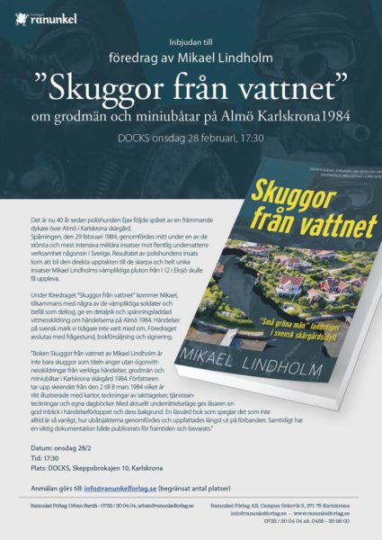 Föredrag av Mikael Lindholm om grodmän och miniubåtar på Almö 1984.