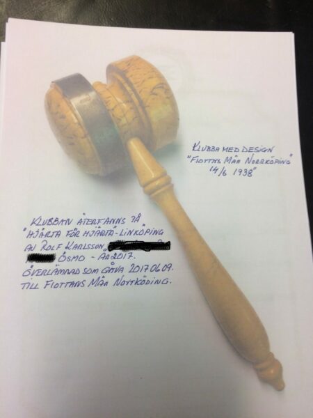 Var en Annons i Norrköpings Tidningar den 11/6 1938. Där intresserade var välkomna till kaffe Björkdungen den 14 juni 1938 kl. 7,30 em. för bildadet av en lokalförening till Flottans Mäns Riksförening.Som ett bevis på detta datum återfanns vår ordförande klubba med texten ”Flottans Män Norrköping 14/6-38″ av Rolf Karlsson Ösmo på ” Hjärta till hjärta” i Linköping. Rolf återbördade klubban den 9/6-17 till Flottans Män Norrköping som gåva. ETT STORT TACK TILL ROLF KARLSSON.