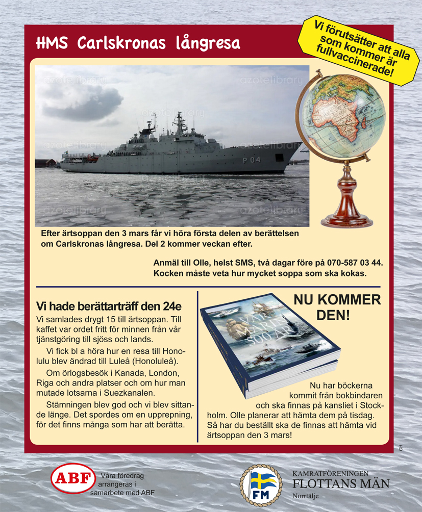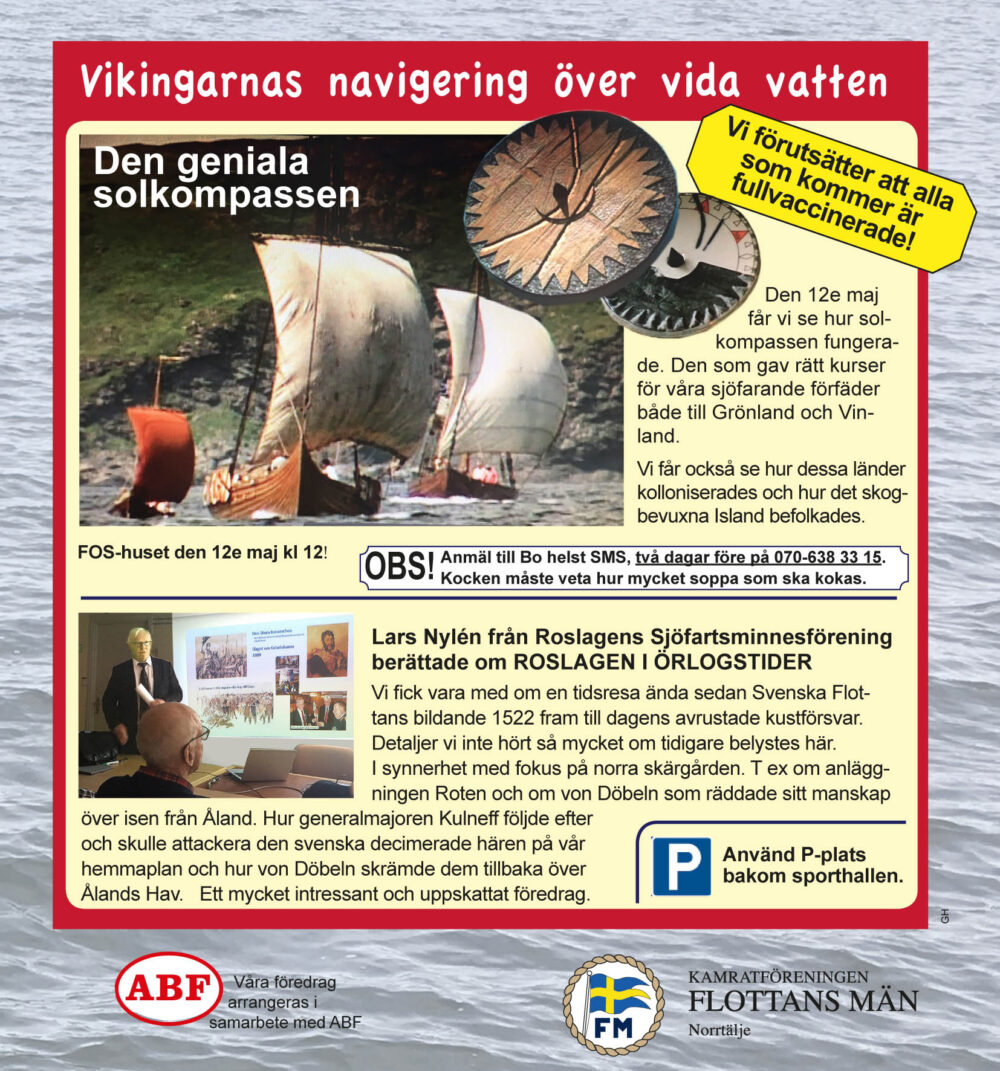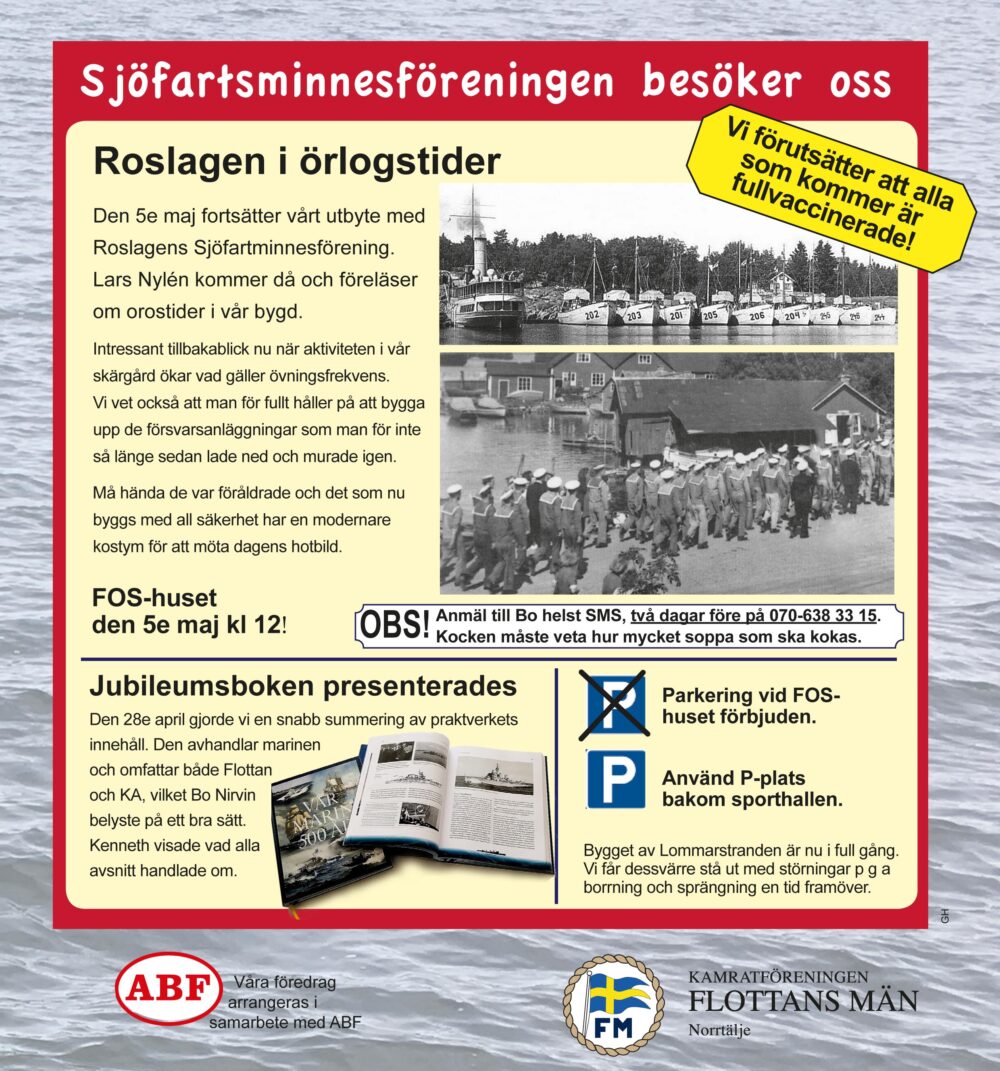 2022 Efter pandemin Här visas programmet vid våra torsdagsträffar under våren 2022. 19 Maj Gräddöasken 12 Maj Solkompassen 5 maj Roslagen i örlogstider 28 April Jubileumsboken 21 April Russarö 7 April Bodekull 31 Mars Årsmöte 24 Mars Harald Hårfagre 17 Mars Marinen 500 år. 10 Mars Carlskrona.forts. 3 Mars Carlskrona