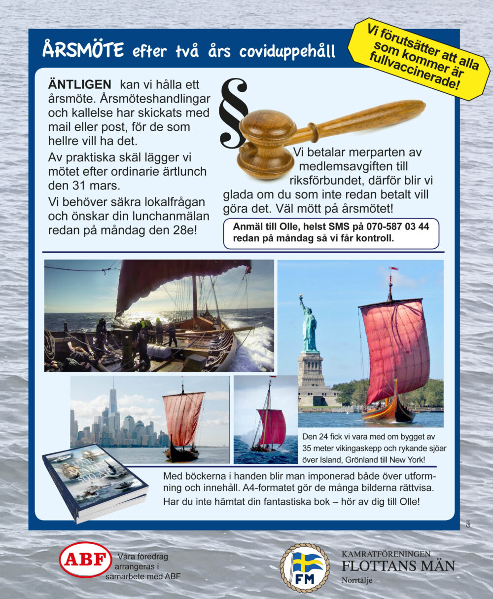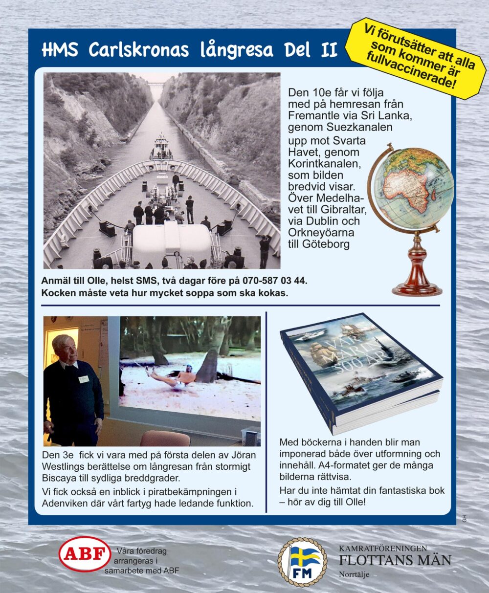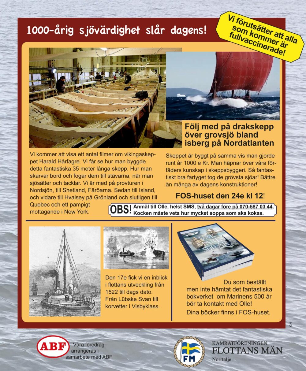 2022 Efter pandemin Här visas programmet vid våra torsdagsträffar under våren 2022. 19 Maj Gräddöasken 12 Maj Solkompassen 5 maj Roslagen i örlogstider 28 April Jubileumsboken 21 April Russarö 7 April Bodekull 31 Mars Årsmöte 24 Mars Harald Hårfagre 17 Mars Marinen 500 år. 10 Mars Carlskrona.forts. 3 Mars Carlskrona