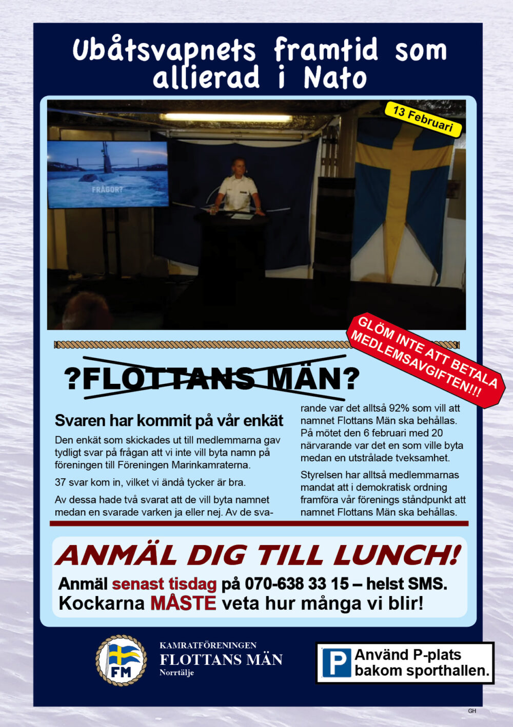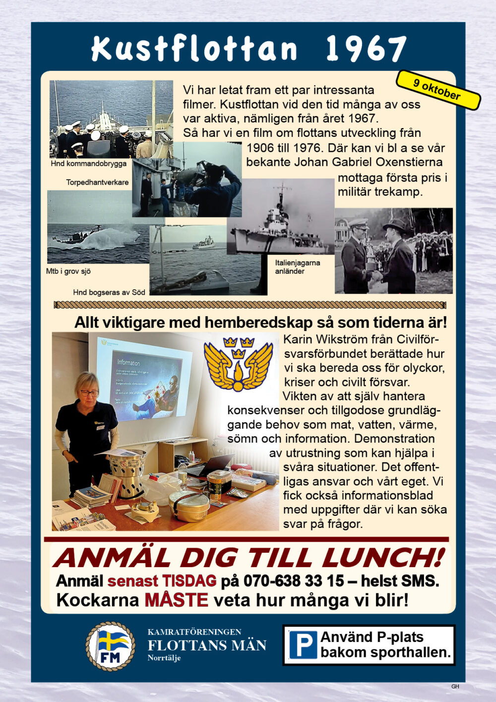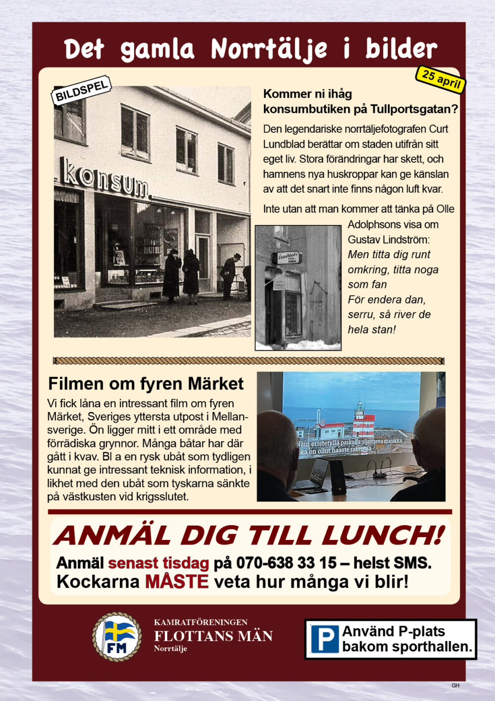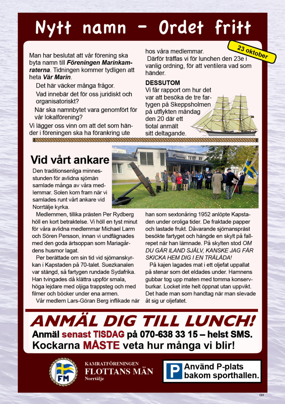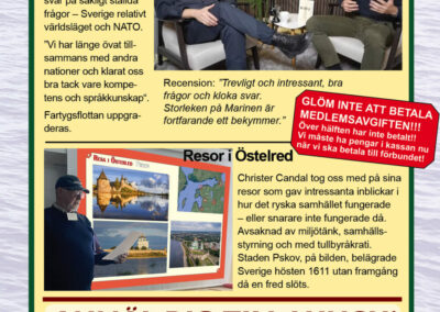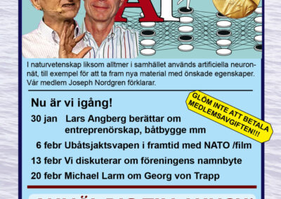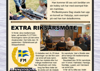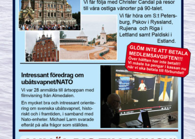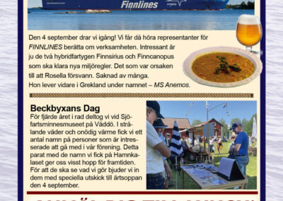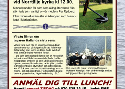 År 2025 namnbyte Här visas programmet för 2023.. 6 Februari Namnfråga 23 Januari Joseph 13 Febr Ubåt I NATO 20 Febr Resor I österled 27 Febr Marinchef Norleìn 25 April C Lundblad 8 Maj Kris Och Krig 15 Maj Roslagsmuseet 22 Maj Stockholmsför Besöker 5 Juni Sillunchen 4 September Finnlines 25 Sept Rodenhake 25 Sept Rodenhake 2 Oktiber Hemberedskap 9 Oktober Film Kustflottan Och 1916 1976 16 Okt Ankaret 23 Oktober Ordet Fritt 6 November 13 November 27 Nov Finnline O CWH 4 Dec Julkorv