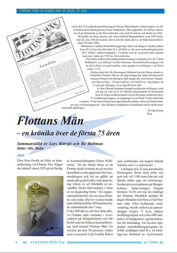 Du får på sidan 4-21 en krönika över de första 75 åren. På sidan 44-46 är föreningen Flottans Mäns ordförande presenterade.