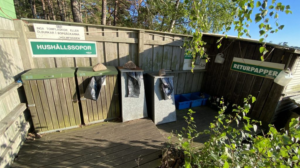 Vi har sophämtning varje vecka under högsäsong. Vi sorterar glas, pant och kartong på sidan om. Hjälp gärna till att bära glas då vi åker på handligstur och slänger dessa i återvinningen på Ingmarsö. Kartong finns det en lår bredvid och pant i den blåa panttunnan. Bryt sönder grillpinnarna så dom inte sticker någon som ska hantera säckarna.