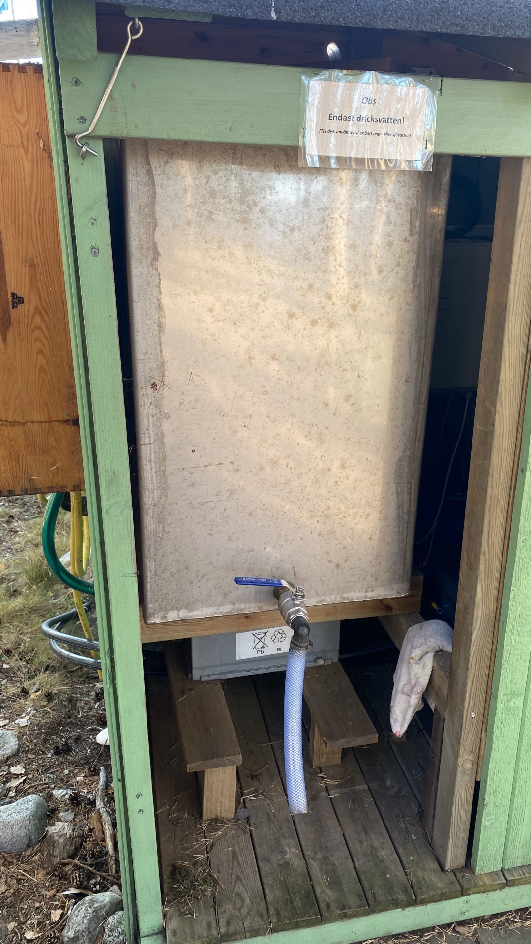 Jo vi har en så kallad osmos anläggning som tar upp sjövatten och genom filtrering och osmos gör om det till ett drickbart vatten. Sedan hämtar man vatten i dunk vid vattentanken. I samband med att vi gör vatten så kör vi elverket och då kasn man passa på och ladda en dator också om man behöver.
