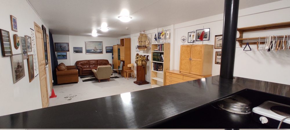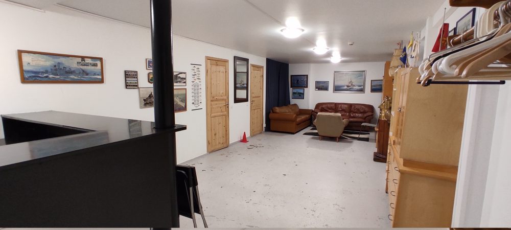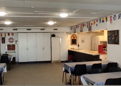 Det finns ett fullt utrustat kök med glas, porslin och bestick samt stolar och bord till 50 pers.
