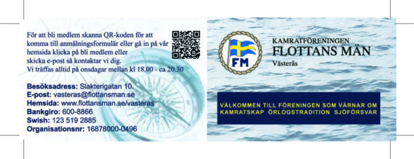 Våra nya visitkort har kommit. Har du några som är tänkbara medlemmar kan du hämta en bunt på Flottans Män. Vi träffas varje onsdag kl 18.