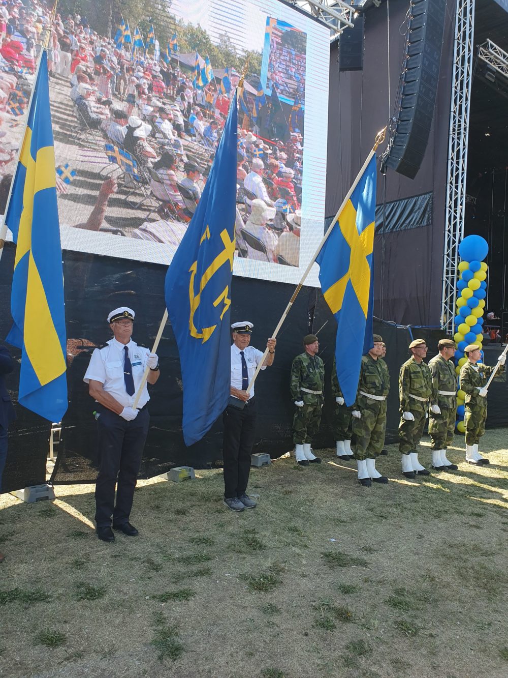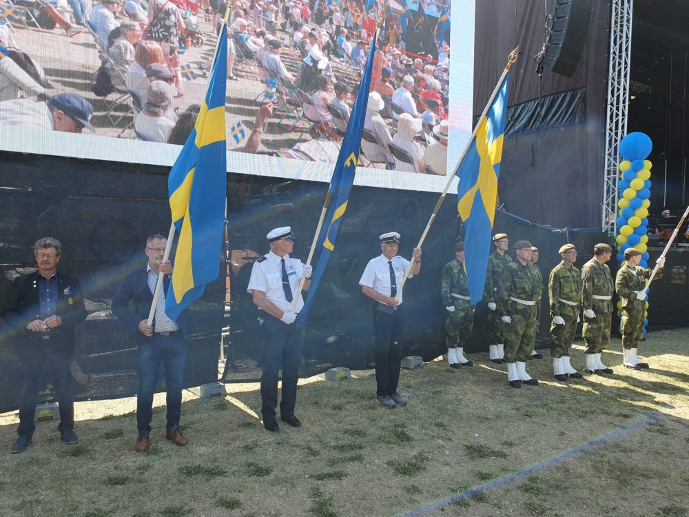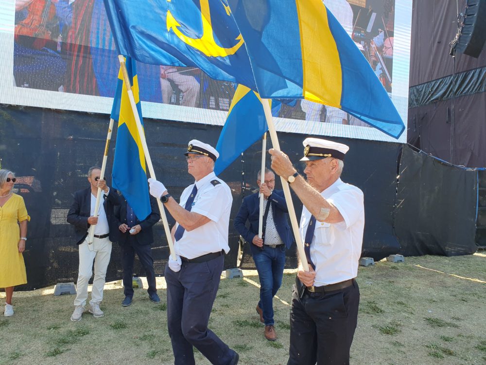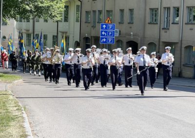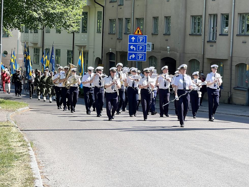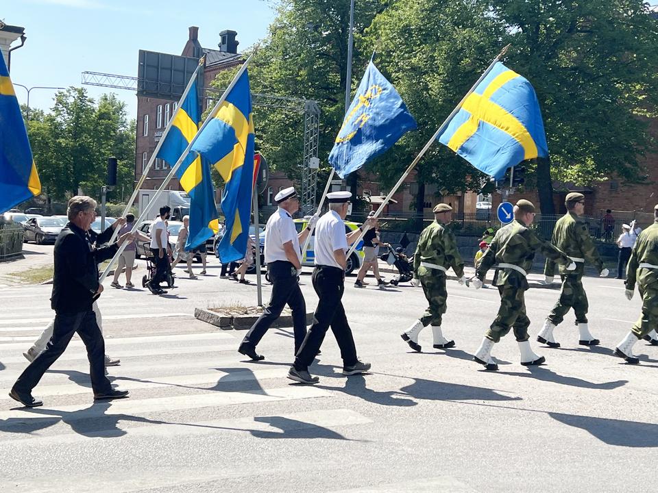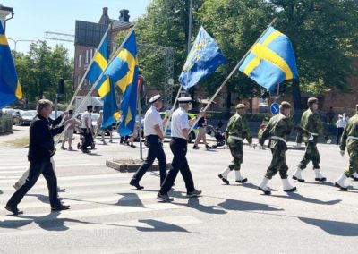 Flaggmarschen utgår från Fiskartorget i centrum av Västerås och går till Djäkneberget. En lustig sak är att nyblivna svenska medborgare gärna vill låta sig fotograferas med oss. Nationaldagen avslutades i sedvanlig ordning med fika och tårta i Marinlokalen.