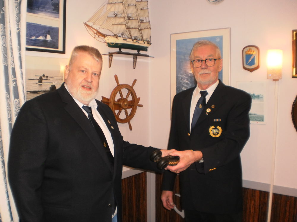 V. ordf. Leif Carlsson överlämnar klubban till nyvalde ordföranden Ove Engkvist